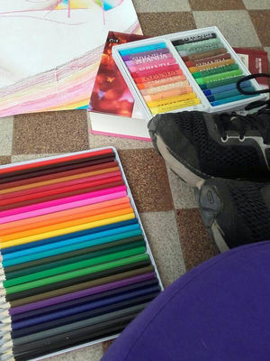 "Ces moment d'atelier sont des parenthèses, un moment où je laisse jaillir des choses qui parfois m'étonnent moi-même. Le climat chaleureux et bienveillant m' invite à la confiance. L'art est un langage que j'utilise trop peu, ces moments sont vraiment très très forts. [Par exemple quand je crée,] je crois que quelques mots découpés arrivent par hasard, et puis je me rends compte que ce sont toutes mes bonnes résolutions que je visualise [en regardant mon oeuvre] sur mon frigo ou dans ma bulle d'hiver."